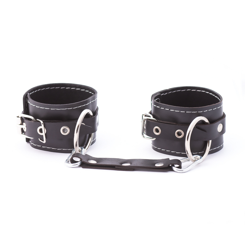 Выполнены оковы из натуральной кожи в черном цвете и декорированы белой строчкой и металлическими клепками